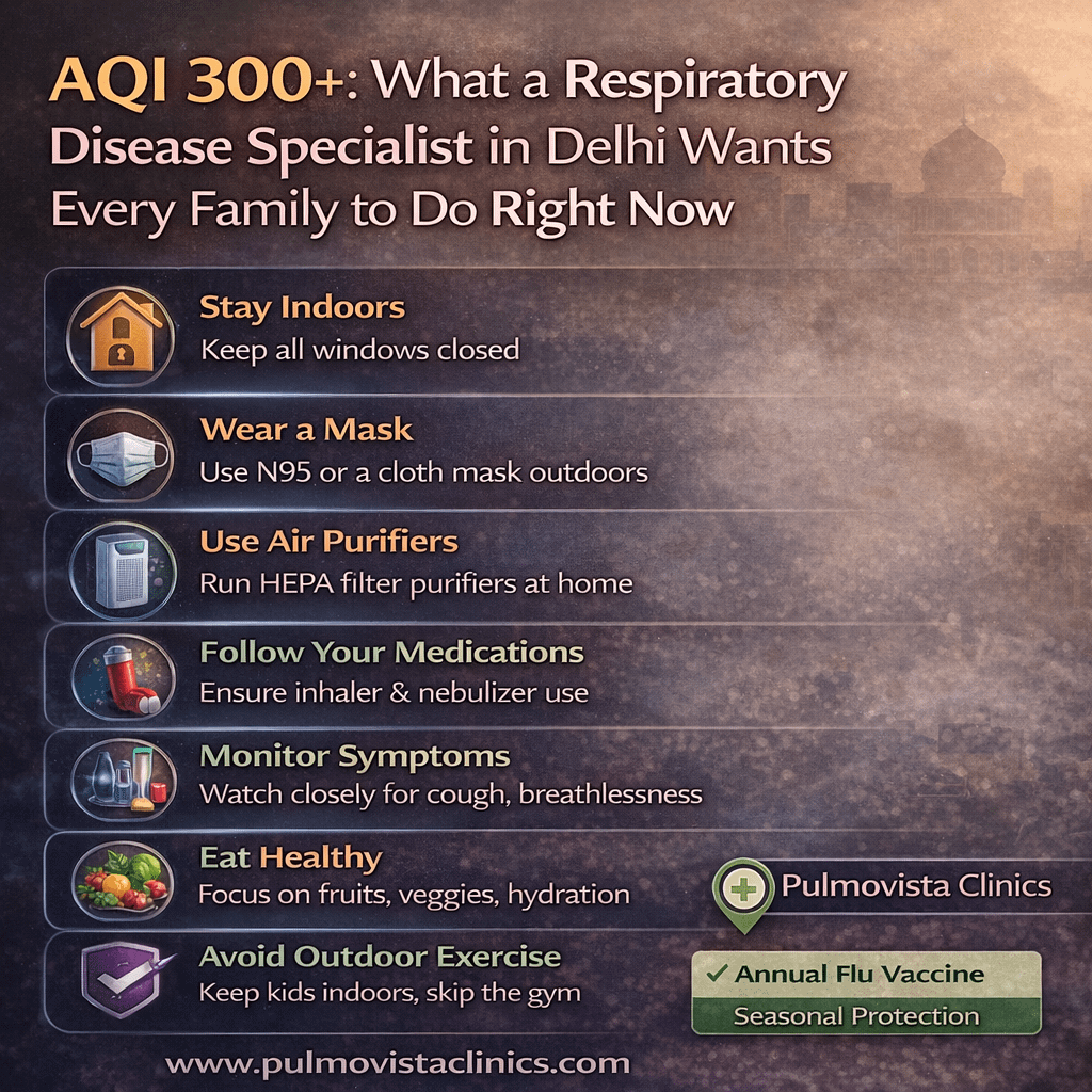 At Pulmovista Clinics, every patient with a chronic respiratory condition receives a personalised written action plan that includes specific instructions for AQI 300+ events. Here is the core of what that plan contains — presented as a family guide for every Delhi household: