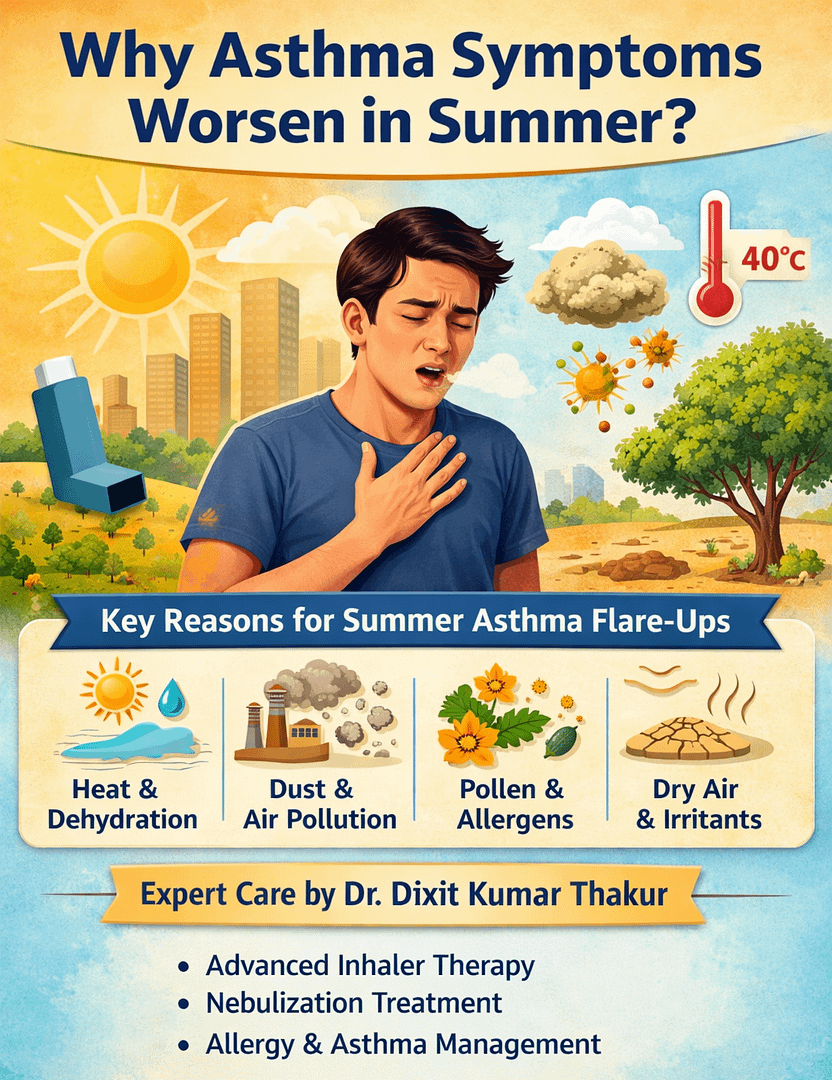 Summer can be a challenging season for asthma patients due to heat, dust, pollution, and allergens. These environmental factors can trigger airway inflammation and worsen breathing problems.