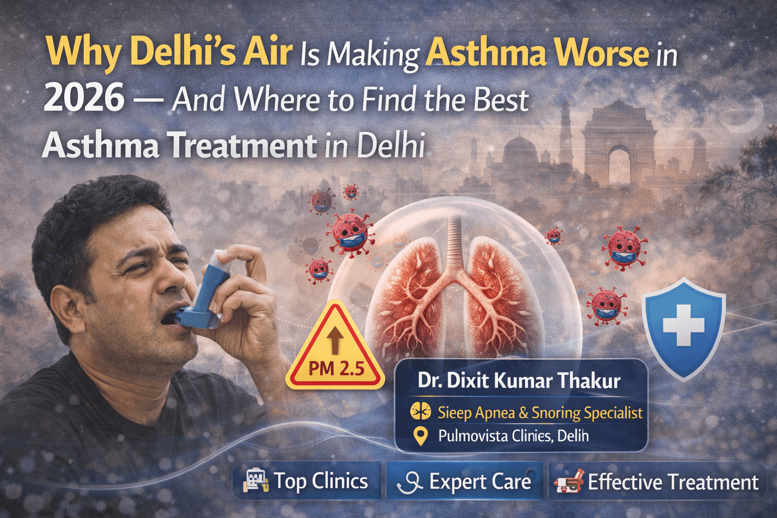 If you’ve noticed your asthma getting harder to control in 2026, you are not imagining it. Delhi’s air quality crisis has reached a critical inflection point — one that directly and measurably worsens asthma symptoms for millions of residents. This comprehensive guide explains the science behind why Delhi’s air is uniquely dangerous for asthma patients, which seasonal triggers you must know about, what the latest biologic therapies can do for you, and how Pulmovista Clinics — led by Dr. Dixit Kumar Thakur — delivers the best asthma treatment in Delhi.