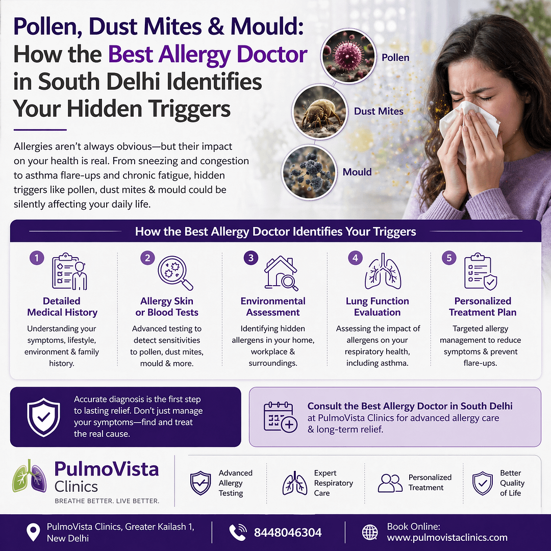 In South Delhi — a region with one of the highest urban allergen loads in India, combining dust mite populations amplified by monsoon humidity, Prosopis pollen from thousands of roadside trees, year-round Aspergillus mould spores, and cockroach allergens in older residential and commercial buildings — the allergy trigger landscape is complex, year-round, and frequently misunderstood. This guide explains exactly how I identify your hidden triggers at Pulmovista Clinics, what the allergy testing process involves, and what we can do once we have found the cause.